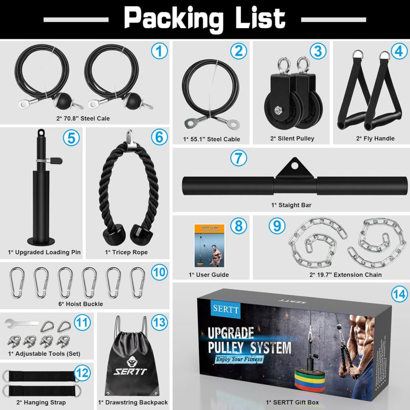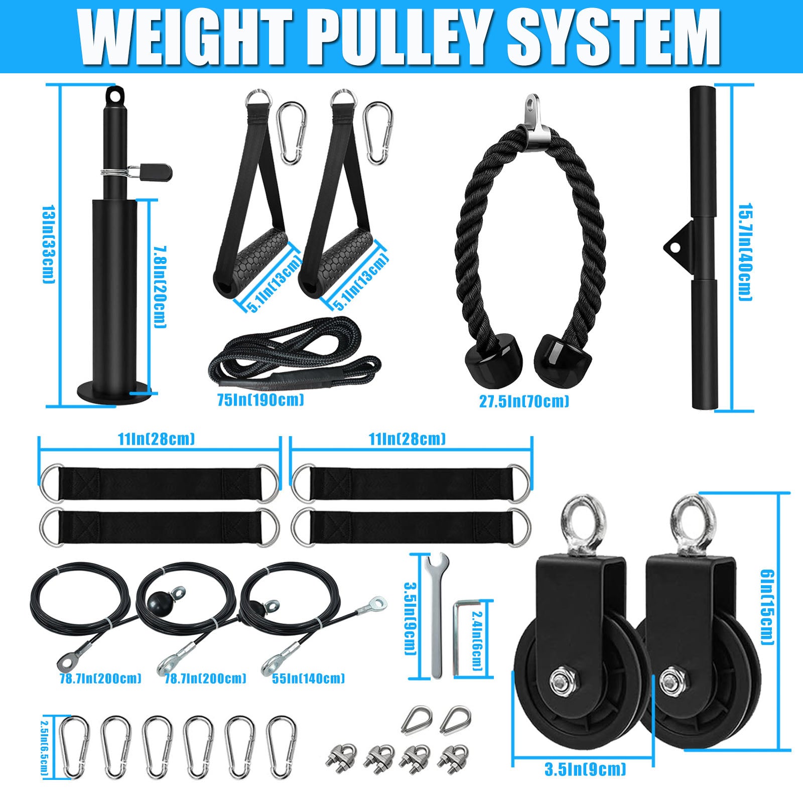 Securely attach the pulley system to a sturdy support bar or anchor point. Adjust the height and resistance according to your workout needs. Maintain regular cleaning and lubrication for smooth operation and long-term performance.