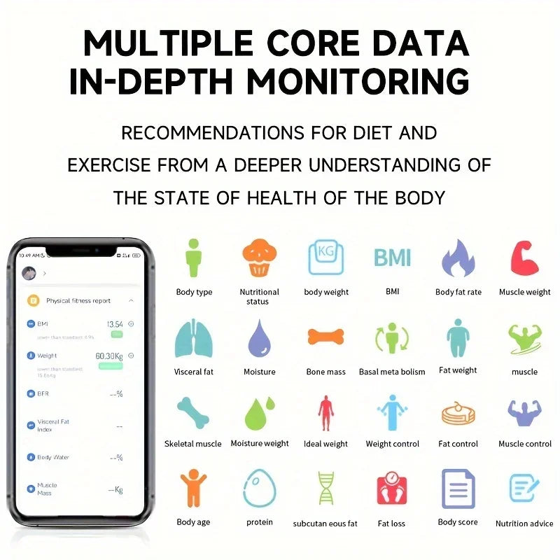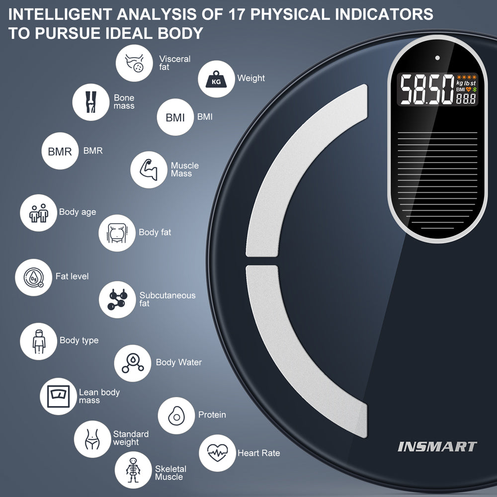 • Data Tracking: Measures 17 essential health metrics including weight, BMI, body fat, muscle mass, heart rate, body water, visceral fat, bone mass, and more.
