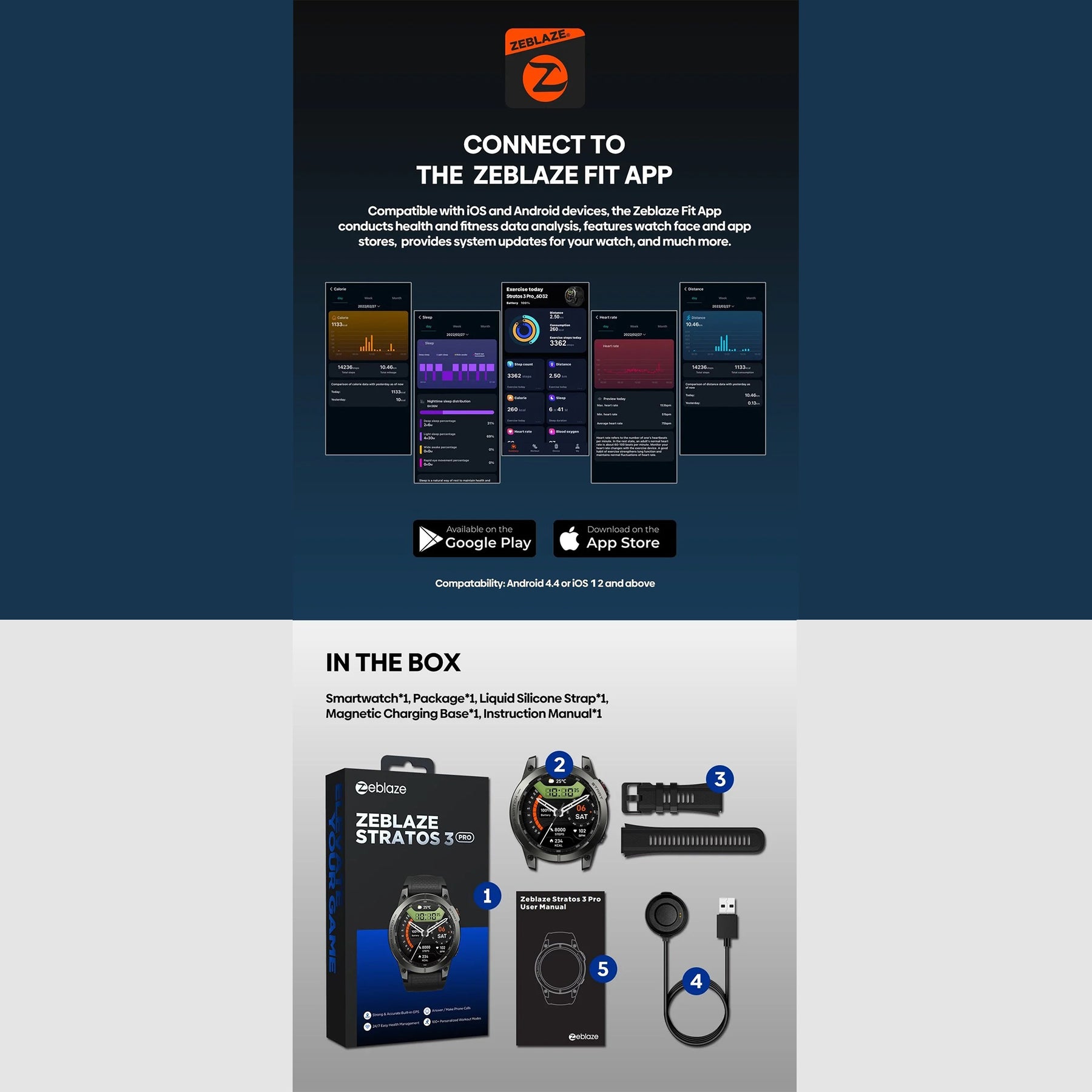 • Compatibility: Fully compatible with Android 4.4+ and iOS 12+ devices via the Zeblaze Fit app.