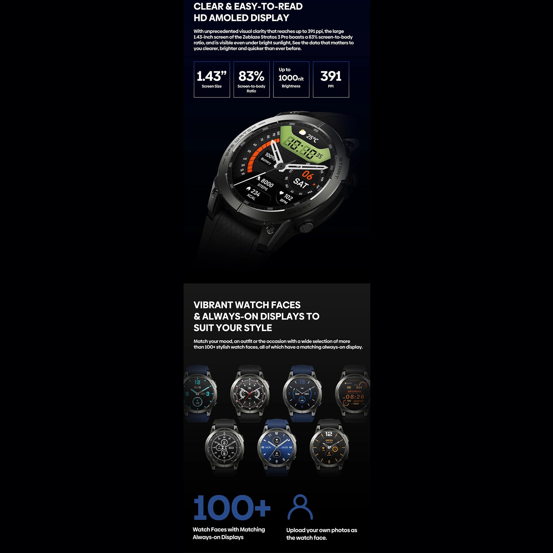 • Custom Watch Faces: Choose from 100+ watch faces with Always-On Display options to suit your personal style.
