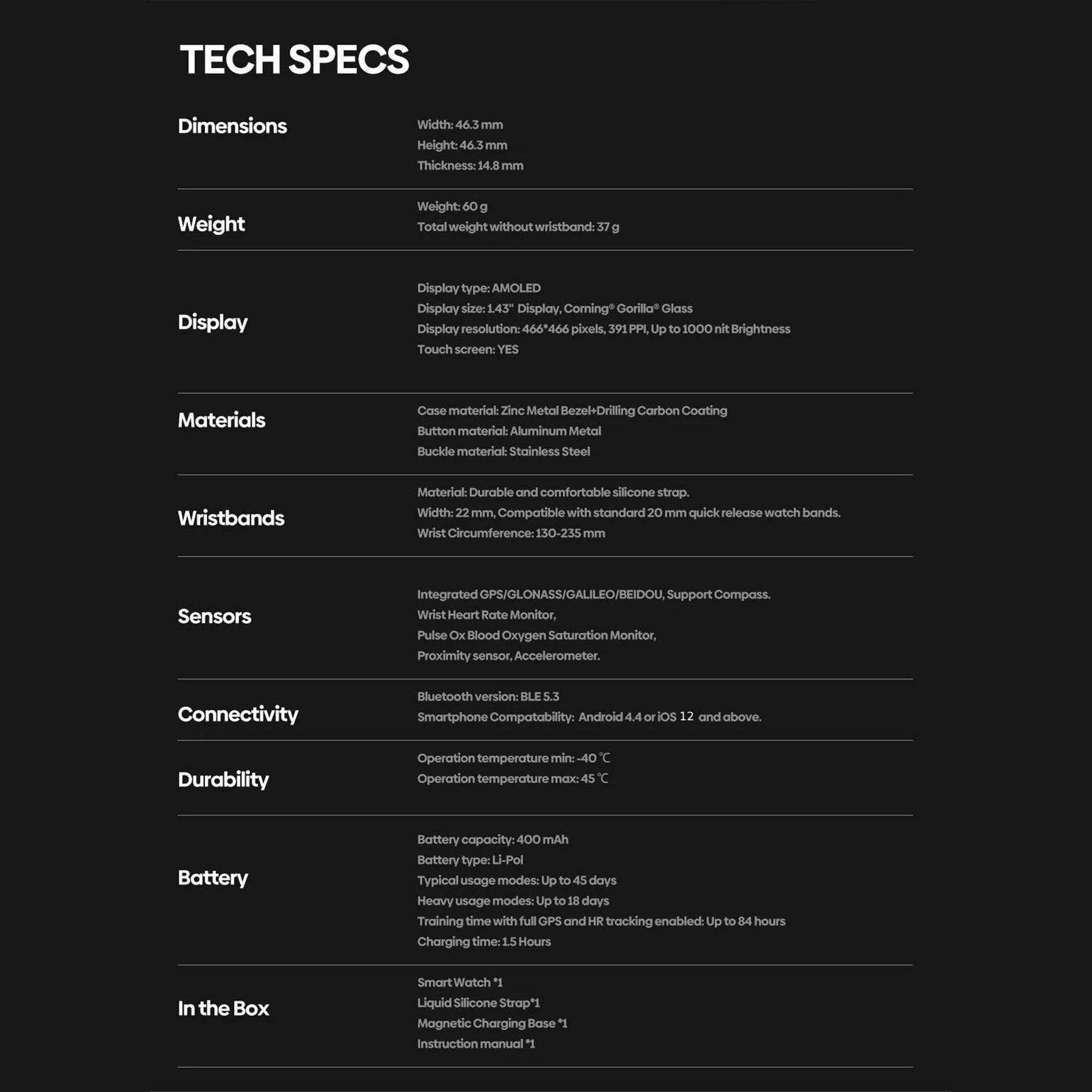 • Display: 1.43” HD AMOLED display with 391 ppi, offering crisp, vivid visuals and excellent readability even under bright sunlight.